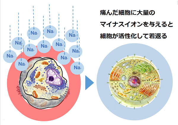 痛んだ細胞の原子は電子が奪われ不安定な状態(プラスイオン状態)になっています。(これを酸化と言います)